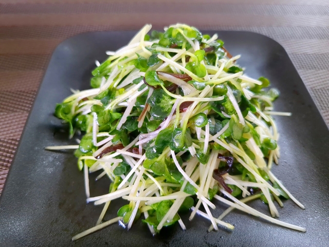 かいわれとたくあんを使って簡単にできる副菜です。
